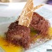 Otra grata sorpresa fue encontrarnos con la pasta kataifi de chocolate, pero mejor aún fue degustarla en un Tataki de atún enrollado en pasta kataifi de chocolate con vinagreta de mango, polvo de palomitas y crujiente de parmesano. El tataki resultó muy jugoso, el punto de chocolate de la pasta era bueno, pero mejor aún la vinagreta de mango que regaba este plato y que jugaba a ganar.