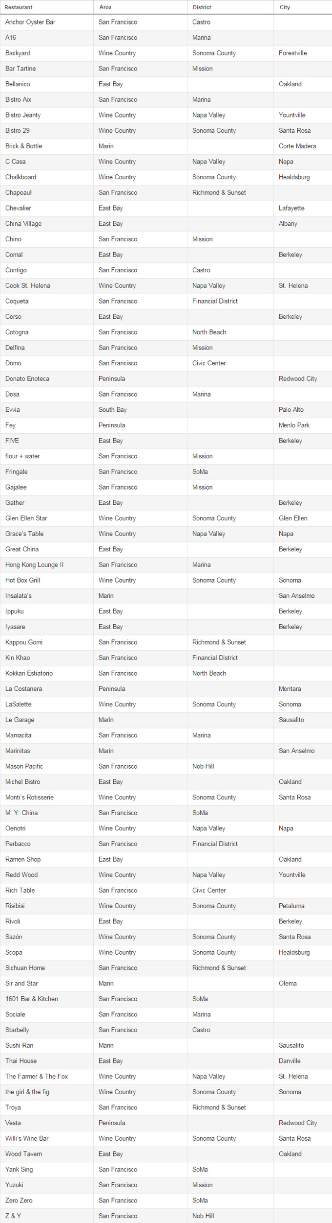 En el listado de restaurantes Bib Gourmand aparecen establecimientos de San Francisco, Este y Sur de la Bahía (subregiones del Área de la Bahía de San Francisco), Wine Country (región del Norte de California famosa por la producción de vinos), el Condado de Marin y la Península de San Francisco. A continuación os facilitamos el listado de restaurantes que han sido galardonados con el distintivo Bib Gourmand: