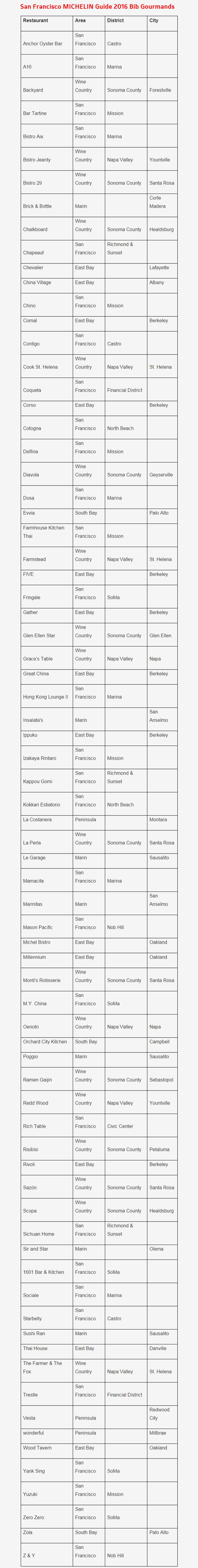 En la lista de Restaurantes Bib Gourmand San Francisco 2016 aparecen los establecimientos más valorados por los inspectores de la guía en la ciudad de San Francisco, Este y Sur de la Bahía (subregiones del Área de la Bahía de San Francisco), Wine Country (región del Norte de California famosa por la producción de vinos), el Condado de Marin y la Península de San Francisco. Este año Michelin ha seleccionado 74 establecimientos, de ellos, 12 son nuevas inclusiones, sin embargo, con respecto a los resultados del año pasado, el número de restaurantes se ha reducido en cuatro, siendo el segundo año consecutivo que esta lista se reduce en número de establecimientos.