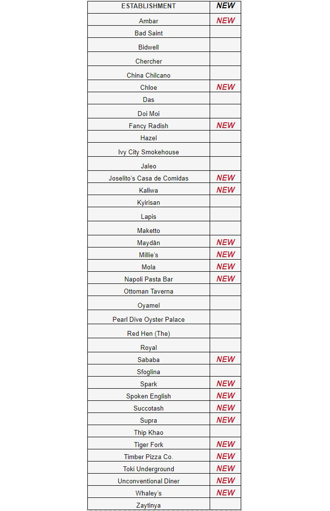 Sólo dos restaurantes han desaparecido de este listado, 2Amys (cerrado temporalmente) y Boqueria (por traslado), algo poco habitual, ya que en los listados Bib Gourmand se suelen producir muchos movimientos. Claro, que hay que recordar que el listado del año pasado llamó especialmente la atención por un hecho inusual, no se produjo ninguna eliminación. Los recién llegados a esta categoría son los siguientes: Ambar, Chloe, Fancy Radish, Joselito’s Casa de Comidas, Kaliwa, Maydan, Millie’s, Mola, Napoli Pasta Bar, Sabana, Spark, Spoken English, Succotash, Supra, Tiger Fork, Timber Pizza Co., Toki Underground, Unconventional Diner y Whaley’s.