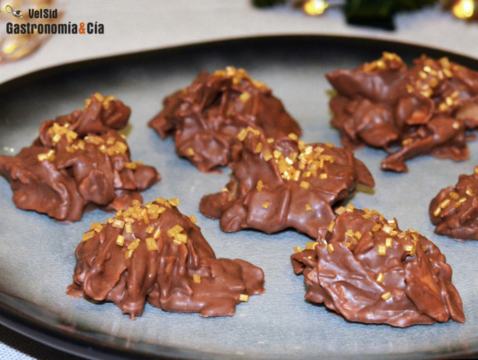 Dispón sobre la mesa de trabajo una hoja de papel vegetal y toma porciones del preparado de chocolate y barquillos con una cuchara, ve depositando las cucharadas sobre el papel vegetal y si lo deseas, reparte unos granillos de azúcar dorado para decorar.