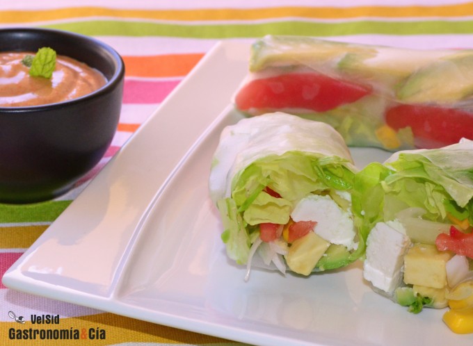 Otra forma de comer una ensalada es haciendo unos rollitos con papel de arroz, podemos poner lo que nos apetezca, así que de vez en cuando optamos por la combinación de aguacate, requesón, cebolla y hierbabuena, entre otros ingredientes, porque nos encanta. Además de poder aderezarse simplemente con aceite de oliva virgen extra y sal, se puede acompañar de una gran variedad de salsas, en esta ocasión hemos aprovechado la Salsa de yogur con mostaza y guindilla que preparamos para comer con el tofu ahumado a la plancha.