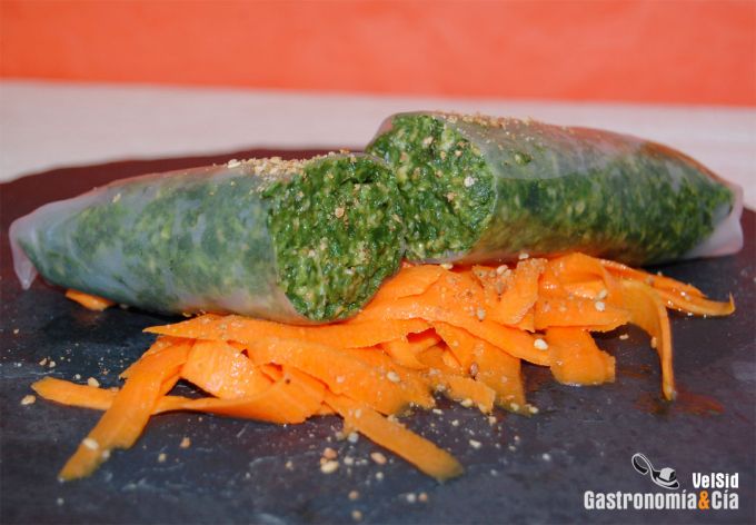 Sirve en los platos una cama de zanahorias, coloca sobre ella los Rollitos de arroz rellenos de espinacas, si lo deseas, cortados por la mitad. Termina espolvoreando un poco de gomasio y a comer. ¡Buen provecho!