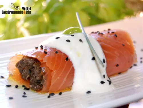 La imagen del rollito de salmón relleno habla por sí sola, así que poco podemos explicar, salvo algunos detalles como el grosor de las lonchas de salmón, es importante encontrar el equilibrio en los sabores, y aunque decimos que las lonchas no sean muy finas, si ya tienes el salmón loncheado siempre puedes hacer un rollito doble, pero entonces convendrá que esté bien relleno para que el intenso sabor del pescado no enmascare demasiado el sabor de los champiñones.