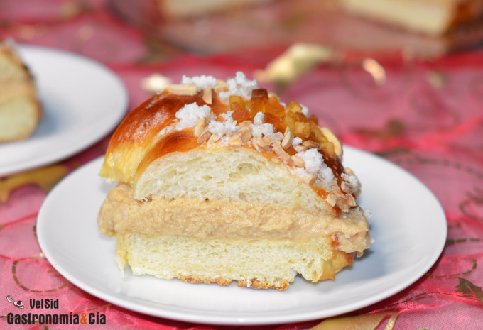 Os comentamos que el segundo roscón no lo hemos rellenado porque merece la pena disfrutar del brioche de Reyes plenamente, tiene un sabor y una esponjosidad sin igual. Además, con la almendra tostada y la naranja confitada casera (aunque si no os gusta se puede quitar) es una delicia inmejorable. Si aún así, queréis rellenar los dos roscones que os saldrán con esta receta, siempre podéis hacer el doble de crema de turrón o preparar nata montada, trufa o cualquier relleno que os guste, en este post tenéis muchas ideas.
