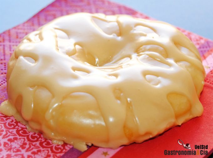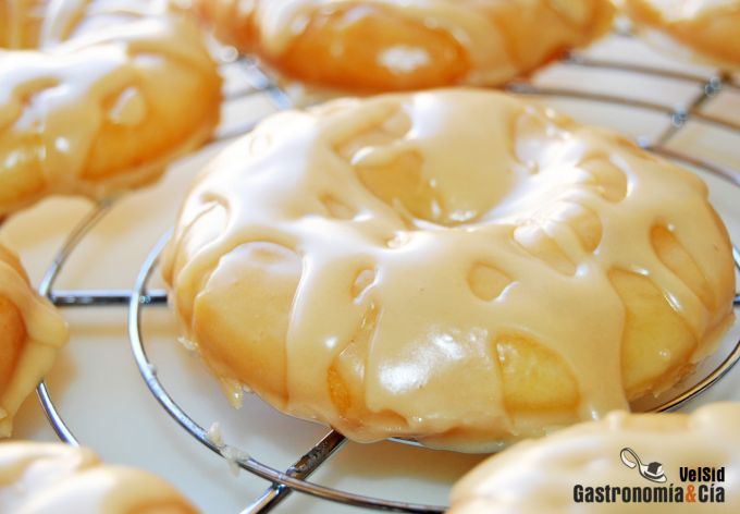 Prepara el baño, pon el azúcar glas en un recipiente que te resulte cómodo para después bañar las rosquillas, añade el almíbar caliente, el zumo de limón (si quieres que se pronuncie más el limón, puedes añadir aroma) y el caramelo, bate bien hasta obtener un fondant ligero.