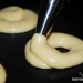 Precalienta el horno a 220º C con calor arriba y abajo. Dispón tres bandejas con papel vegetal, silpat o teflón. Introduce la masa en la manga pastelera y ve escudillándola, dándole forma de rosquilla y dejando espacio entre cada una porque crecerán al hornear. Deja un buen agujero porque se cerrará un poco al aumentar el volumen de la masa.