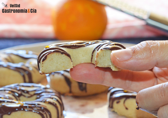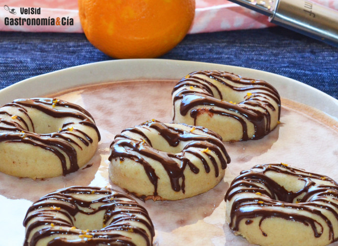 Desmolda las rosquillas de queso fresco y azahar y colócalas sobre una rejilla o sobre papel vegetal. Puedes decorar con un poco de chocolate, para ello, funde un par de onzas de chocolate (mínimo 72% de cacao) y dibuja líneas irregulares dejándolo caer con una cuchara. Para terminar, ralla un poco de piel de naranja.
