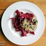 Enrollar cada lámina de urta y colocarlas una al lado de otra en el plato. Disponer unos dados de boniato alternando con el pescado, unas hojas de perejil y unas gotas de aceite de cilantro. Para terminar, verter la roteña fría.