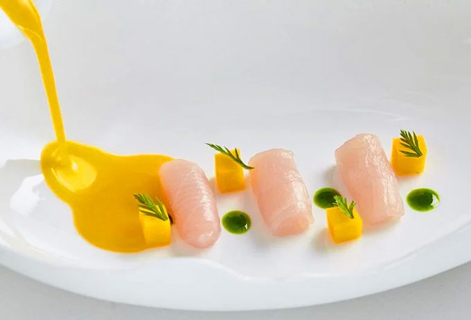 Sobre estas líneas podéis ver la Roteña fría de Juanlu Fernández, veréis que es una receta fácil de hacer, por lo que os recomendamos que toméis nota de la elaboración paso a paso, podréis sorprender a vuestros comensales con una creación de alta cocina inspirada en la tradición y salpicada por la cocina fusión. Básicamente es el pescado laminado y servido crudo con un caldo vegetal y un toque picante aportado por el ají amarillo, un producto originario del Perú.