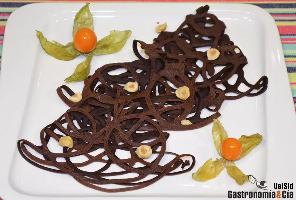 Pon una sartén antiadherente a calentar, vierte unas gotas de aceite de oliva de sabor suave, o de aceite de coco, y unta bien toda la sartén para que esté bien lubricada. Cuando esté caliente, a temperatura media, vierte la masa de chocolate con el biberón haciendo círculos con movimientos ligeros para que caiga en hilo fino, y que éstos se entrelacen al cocer la masas, formando el encaje.