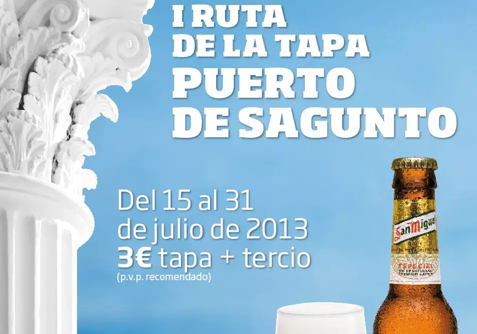 Ayer se presentó la nueva iniciativa de la Asociación de comerciantes y empresarios de Sagunto, la celebración de una ruta de la tapa, pocos municipios deben quedar en nuestro país que no tengan entre su programa de actividades un evento del estilo. Pues bien, hasta final de mes, hasta el 31 de julio, se celebra la I Ruta de la Tapa. Puerto de Sagunto 2013.