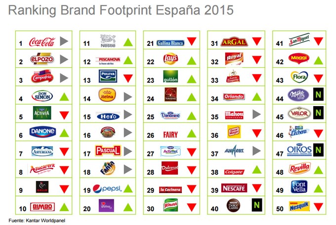 Hay más datos, tanto positivos como negativos, que podemos extraer de este estudio o ranking de marcas de Gran Consumo, aunque nos centraremos en las que pertenecen al sector de la alimentación, bajo estas líneas podéis ver un resumen visual de las 50 marcas en general que más veces se compran en nuestro país. También podéis conocer la información a nivel mundial, es decir, los datos obtenidos en el estudio Brand Footprint 2015 de todo el mundo, a través de este documento (Pdf).