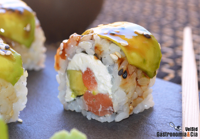 Coloca media hoja de alga nori sobre la esterilla o makisu cubierta con film transparente, con las manos humedecidas con agua, coge un poco de arroz y extiéndelo cubriendo el alga, pero dejando libre un centímetro en la parte superior. A continuación coloca las láminas de aguacate de cobertura y da la vuelta a la preparación de modo que la fruta quede en la esterilla y el alga en la parte superior.