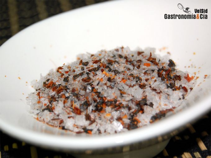 Esta sal de guindillas la vimos ayer en el programa de Canal Cocina “Proteína marina”, presentado por la cocinera del restaurante alicantino La Finca, Susi Díaz. No vimos el programa, llegamos justo en el momento en el que hacía la mezcla de los ingredientes para hacer la sal de guindillas, pero imaginamos que esta chef apasionada de los pescados y mariscos elabora esta sal picante para los productos del mar.