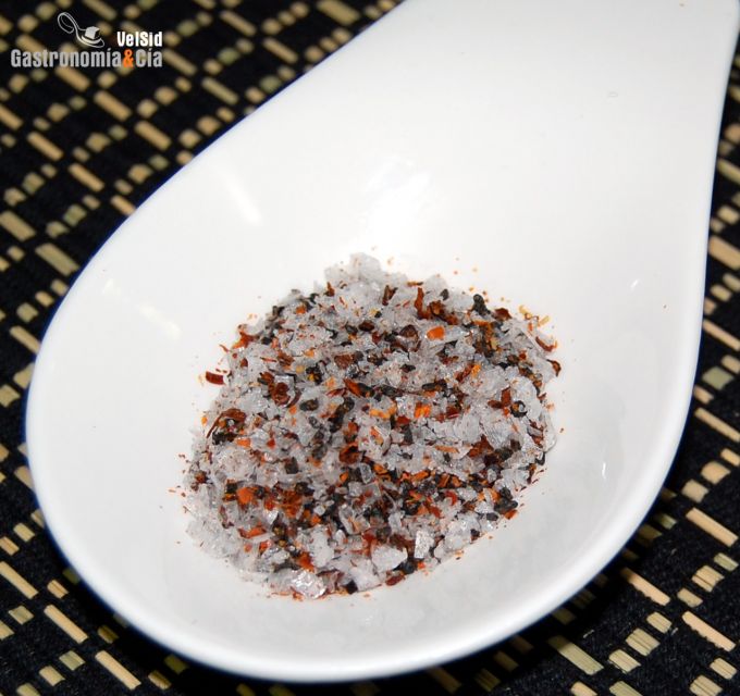 Para elaborar esta sal picante utilizamos 1 cucharada de sal de Hawai (sal negra), 1 cucharada de guindilla molida y 3 cucharadas de sal Maldon. La proporción de cada uno de los ingredientes hay que adecuarla a los gustos de los comensales, si la deseamos más o menos picante, con más o menos sabor volcánico de la sal negra, con sal gruesa, fina o en escamas, etc.
