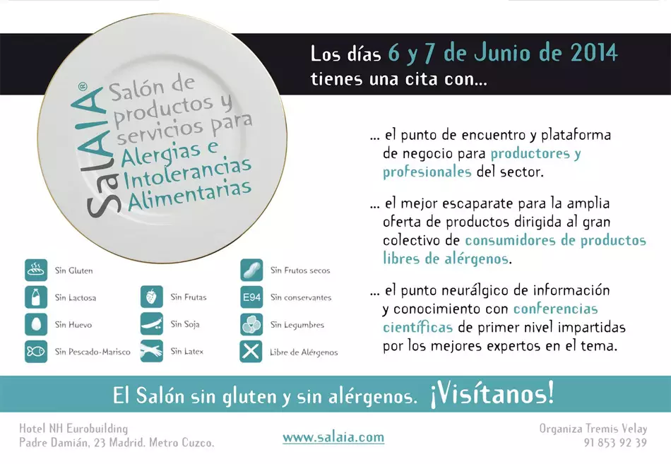 Muy pronto se va a celebrar la cuarta edición del Salón de Productos y Servicios para Alergias e Intolerancias Alimentarias, será los días 6 y 7 de junio cuando tenga lugar SalAIA 2014, este año será en el Hotel NH Eurobuilding de Madrid, en un horario de 12:30 a 20:00 horas el viernes y de 10:00 a 20:00 horas el sábado.