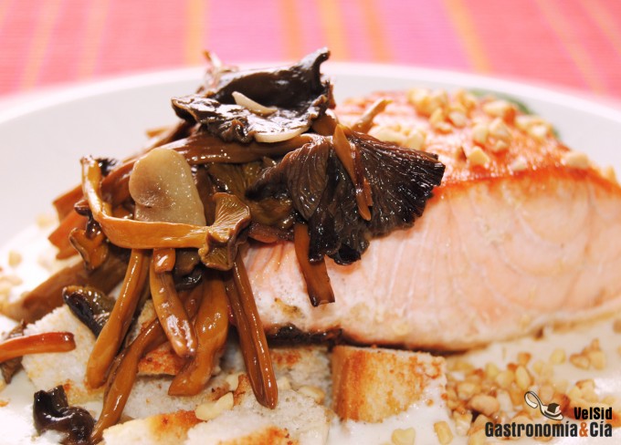 Preparamos el salmón como casi siempre, a la plancha, dorándolo bien en su superficie y dejándolo jugoso en su interior. Pero en esta ocasión hemos preparado varios elementos para acompañar este sabroso pescado, unas setas de temporada, la trompeta amarilla, angula de monte o camagroc, y una crema de almendras ahumada, suave y muy agradable.
