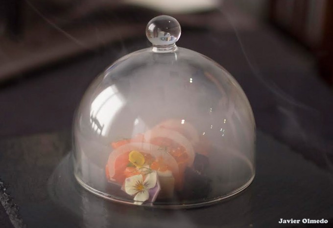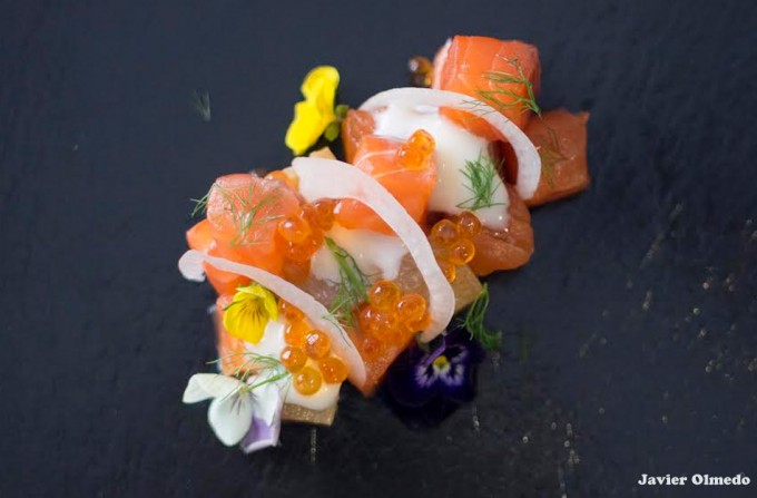 La creación es de Javier Olmedo, es jefe de cocina de Orbe Kitchenbar en Tomelloso (Ciudad Real). Para la confección de este plato de pescado se basa un el marinado tradicional del salmón, y para acompañarlo prepara una gelatina de uva y unas esferas de queso crema curado. Luego lo complementa con hinojo, flores, huevas de salmón… En fin, a continuación Javier explica paso a paso cómo hacer su receta de Salmón marinado con gelatina de uvas y esferificaciones de queso que termina con un toque de humo. Esperamos que os guste.