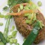 Servir el salmonete relleno acompañado de una cucharada de pisto generosa, a la que daremos forma de timbal. Decorar con las almendras.