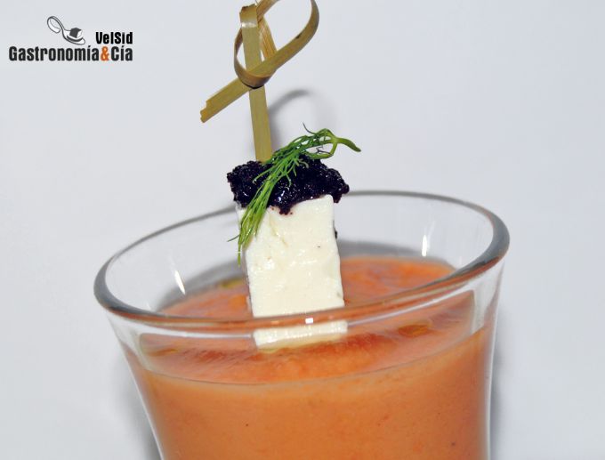 Sirve la receta de salmorejo en cuencos o vasitos y en el centro reparte los daditos de queso feta, o pínchalos en una brocheta para mayor comodidad a la hora de su degustación. ¡Buen provecho!