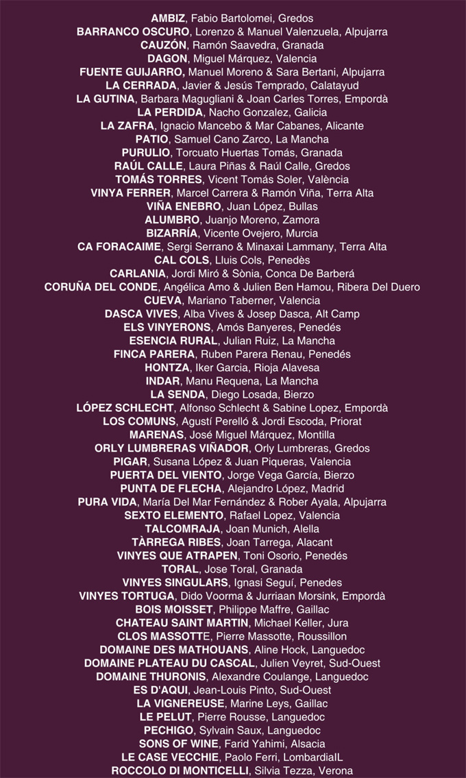 Sobre estas líneas podéis ver las bodegas que participan en esta edición de la feria, son 50 productores procedentes de toda la geografía española. Como no puede ser de otra forma, el salón tendrá un espacio dedicado a la restauración para poder comer algo mientras se disfruta de los vinos naturales, este espacio estará a cargo de El Ginjoler, un negocio que se compone de restaurante, catering y tienda y trabaja con productos ecológicos, de temporada y de proximidad.