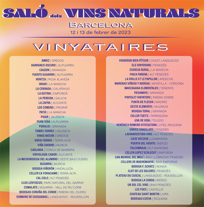 Pues ya se conoce qué viticultores presentarán sus vinos en el Salón de Vinos Naturales, bajo estas líneas podéis ver la lista y comprobaréis que habrá vinos naturales de distintas regiones españolas, como Alicante, Valencia, Terra Alta, Penedès, Bierzo, Ribera del Duero, La Mancha, Requena, Murcia… y también se podrán descubrir algunos vinos naturales franceses e italianos.
