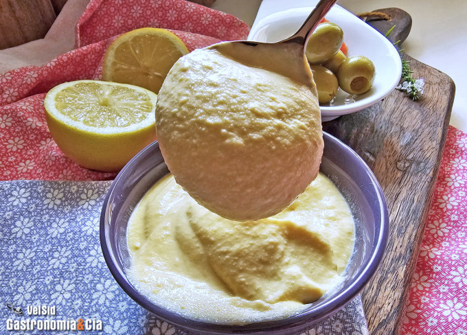 Y un detalle que queremos comentar, aunque veáis que esta falsa mahonesa no queda tan fina como una mahonesa de verdad, se puede conseguir batiendo en un procesador a máxima potencia, añadiendo un poco más de aceite de oliva virgen extra y también ayudará mucho que la yema de huevo no esté totalmente cocida.