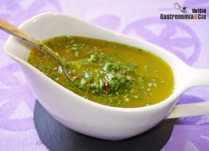 Pon en el vaso de la batidora el ajo, el perejil y la guindilla, añade la piel de limón recién rallada y su zumo recién exprimido. A continuación incorpora el aceite de oliva virgen extra y sal al gusto. Tritura hasta obtener una salsa emulsionada.