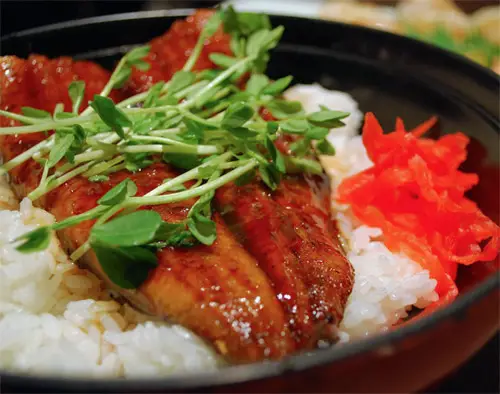 En Kansai utilizan anguilas más pequeñas y sencillamente la asan a la parrilla después de pintarlas con la salsa, ofreciendo una textura más crujiente. El Unagi Kabayaki generalmente se acompaña con arroz, según la presentación de este plato recibe un nombre u otro, por ejemplo Unadon (bol de anguila), término compuesto por Unagi (anguila) y Donburi (bol de arroz).