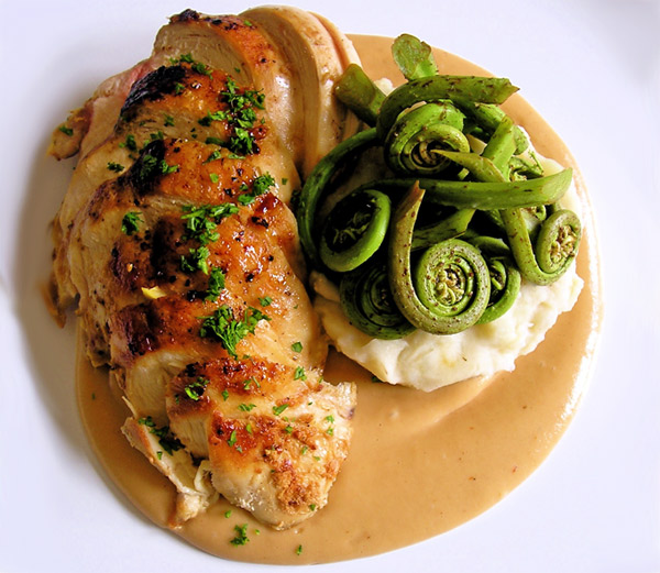 En ese momento se puede retirar del fuego y añadir mantequilla que aportará más cremosidad y brillo a la salsa, que podemos hacer más fina pasándola por el chino antes de servir. Como veis, es una salsa muy sencilla y que sienta extraordinariamente bien a unas simples pechugas de pollo a la plancha.