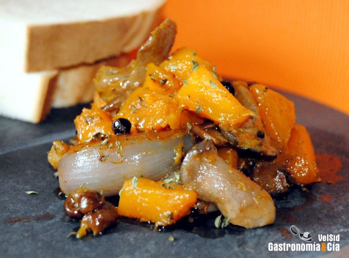 Sirve en los platos el Salteado de setas y calabaza acompañado de la estrella del plato, el jamón ahumado, y junto a él (o en la panera) las rebanadas de pan. Un buen vaso de vino y a disfrutar. ¡Buen provecho!