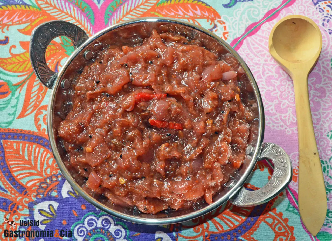 Cocinamos la carne de tomate picada en brunoise con las especias a 70º C durante 15 minutos. Una vez cocinado, cortamos la cocción en agua con hielo. Mezclamos la ventresca de toro bien picada con el tomate, la soja y el kizami wasabi.