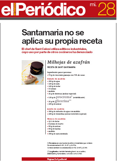 El trabajo periodístico de Pau Arenós le ha llevado hasta una receta de Santi Santamaria en la que indica el uso de aditivos alimentarios fabricados por la industria química, procrema y glicerina. El Milhojas de azafrán de Santi Santamaria fue publicado en Magazine Digital el pasado año, el propio chef define que “la procrema es una mezcla de aditivos industriales que contiene los emulsionantes E-401, E-471 y E-472ª. Contiene también los estabilizantes E-412, E-407 y E-340. La glicerina, también llamada glicerol, es un aditivo, estabilizante y humectante, conocido como E-422.”