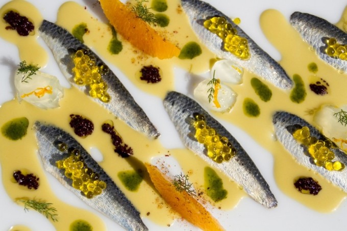 Sobre estas líneas podéis ver un plato de Oriol Castro, Eduard Xatruch y Mateu Casañas, también conocidos como exbullinianos, pues hasta su cierre, fueron jefes de cocina de elBulli. Además de continuar trabajando con Ferrán Adrià en elBulliFoundation, han abierto dos restaurantes, Compartir en Cadaqués y Disfrutar en Barcelona, pero seguramente esto ya lo sabéis, así que vamos con la receta de Sardinas marinadas, aceituna y naranja del Restaurant Compartir.