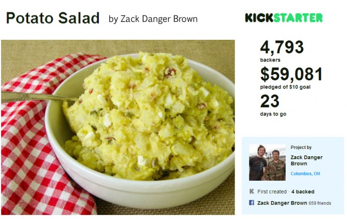 Hace un par de días nos sorprendía una propuesta en la plataforma de financiación popular Kickstarter, el estadounidense Zack Danger Brown pedía financiar una simple ensalada de patata y solicitaba 10 dólares (unos 7 euros). La propuesta se podría considerar bastante absurda y no merecería ser destacada, sin embargo, 1.100 personas habían participado y Zack Danger ya había logrado recaudar más de 5.000 euros. Por más que lo pensemos, es difícil concebir qué ha ocurrido con esta ensalada de patata, hemos realizado un seguimiento del proyecto y vemos que la cifra recaudada asciende sin parar.