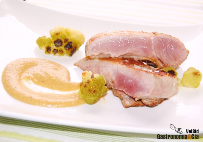 Sirve en los platos la salsa de caqui y Garam masala, coloca los cortes de secreto de cerdo y condimenta con sal Maldon. Termina con las flores de brócoli y un hilo de aceite de oliva virgen extra.