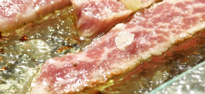 Limpiamos los secretos de la grasa sobrante que traerán adherida. Calentamos una plancha a fuego medio y marcamos los secretos sin nada de grasa, durante 5 segundos por cada lado.
