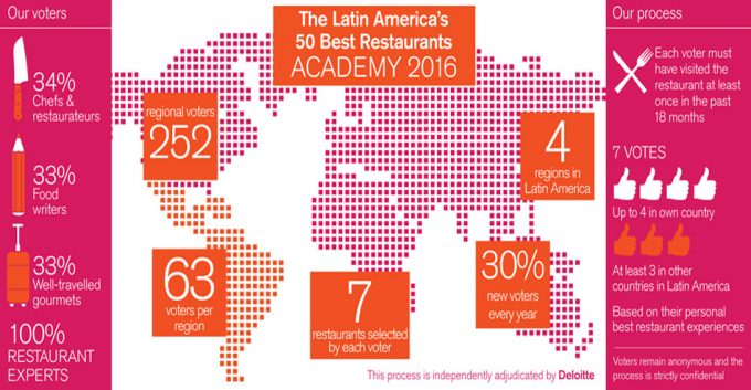 La división de regiones es la siguiente, México y Centro América, Latinoamérica del Norte, Latinoamérica del Sur y Brasil, en cada una de ellas operan 63 miembros formados por reconocidos críticos gastronómicos, gourmets, cocineros y restauradores, todos ellos forman parte de la Academia Gastronómica de América Latina. Los países que se incluyen en la votación son Argentina, Belice, Bolivia, Brasil, Chile, Colombia, Costa Rica, Ecuador, El Salvador, Guayana Francesa, Guatemala, Guyana, Honduras, México, Nicaragua, Panamá, Paraguay, Perú, Surinam, Uruguay y Venezuela.