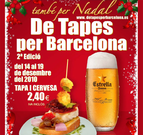 Se mantiene el precio de la tapa en esta segunda edición de De Tapes per Barcelona, 2’40 euros y se incluye la cerveza del patrocinador, Estrella Damm. Este evento organizado por el Gremio de Restauración y la Cámara de Comercio de Barcelona, ha visto aumentada la participación por parte de los establecimientos de la ciudad, con un total de 49 establecimientos, y se espera de igual modo que la afluencia sea mayor, superando las 25.000 tapas servidas en la primera ruta de la tapa.