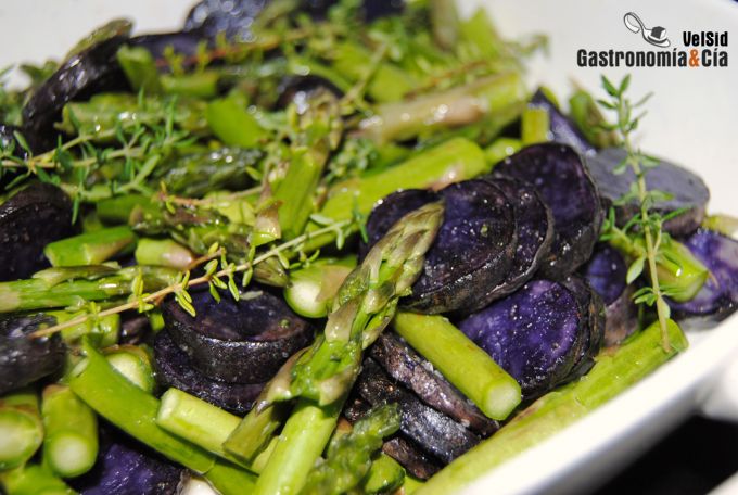 Cazuelita de espárragos y patata violeta (sin jamón)