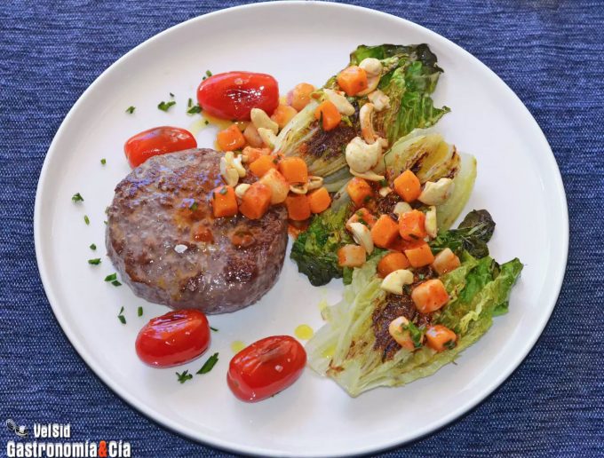 Hamburguesa al plato con cogollos a la plancha y aderezo de kimchee y anacardos