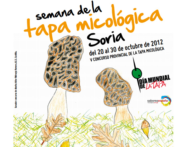 Como luce en el cartel de este evento, por el que hay que felicitar a Aitor Ridruejo del IES Castilla, ganador del concurso convocado por ASOHTUR para ilustrar el cartel de la V Semana de la Tapa Micológica de Soria, estas jornadas tendrán lugar del 20 al 30 de octubre de 2012. Participan en ellas 45 establecimientos de hostelería que se encuentran en Soria y provincia, que además de ofrecer sus tapas con setas, entran a formar parte del ‘Concurso Provincial de la Tapa Micológica’.