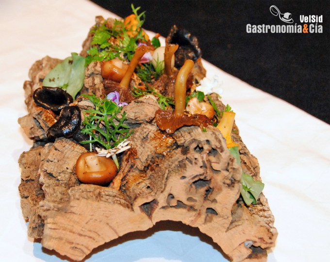 Presentar las setas impregnadas sobre un tronco de corcho, para transmitir el hábitat de las setas de otoño, y terminar con las hierbas ligeramente aliñadas.