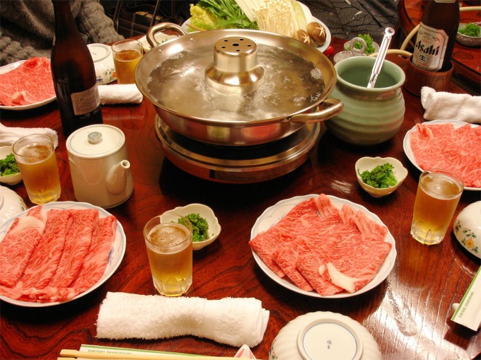 Básicamente este plato se compone de un caldo dashi caliente (se sirve sobre una hornilla o similar) en el que se sumergen carnes (principalmente cortes de buey o ternera muy tiernos y cortados muy finos, pero también se hace con pollo, pato, cerdo…), pescados, algas, setas, verduras e incluso fideos. Cada ingrediente debe estar convenientemente preparado para que al sumergirlo en el dashi adquiera temperatura, se cocinan lo mínimo, aunque claro, cada comensal puede hacerlo a su gusto.