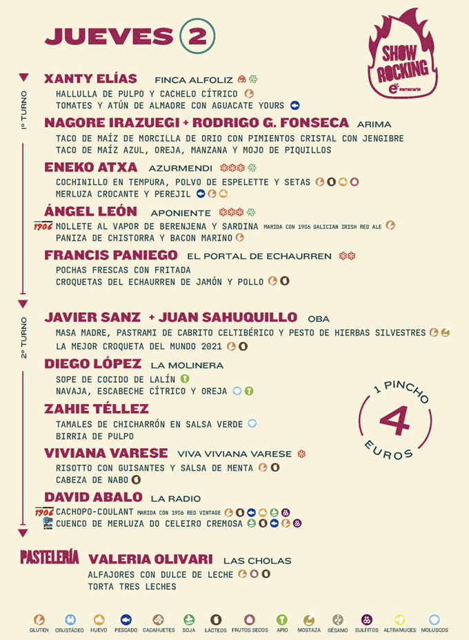 Ángel León, Xanty Elías, Francis Paniego, Eneko Atxa, Roberto Ruíz, Andoni Luis Aduriz, Benito Gómez, Javi Olleros, Vicky Sevilla, Begoña Rodrigo, Lucía Freitas, Yolanda León, Juanjo Pérez, Artur Martínez, Diego Guerrero, Dani López, Alejandra Herrador, Emanuel Carlucci, David García, Viviana Varese, Javier Sanz, Juan Sahuquillo… Por cierto, como novedad este año se ha presentado la repostería que vendrá de la mano de Oriol Balaguer (La Duquesita), Sara Pequeño (Ms. Robinson) y Valeria Olivari (Las Cholas).