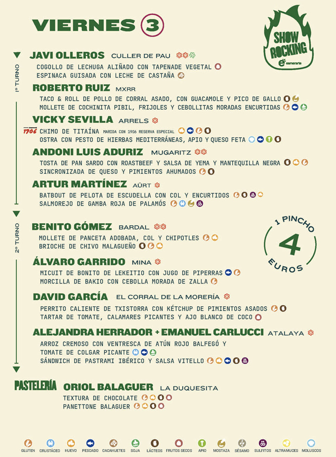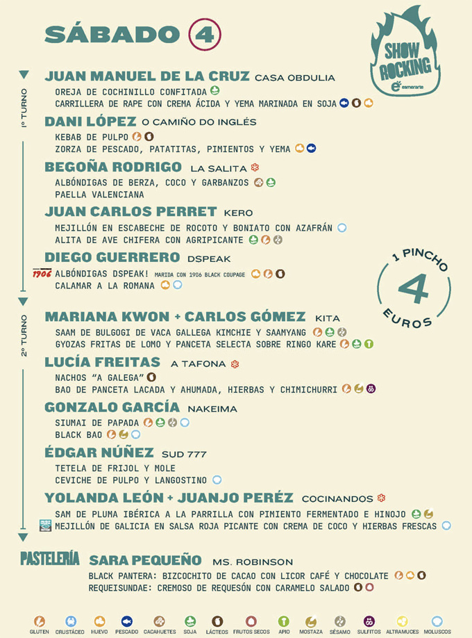 En total son 39 chefs (que suman 24 estrellas Michelin) los que participan en la nueva edición de ShowRocking, la sección gastronómica del festival PortAmérica, de la que cada año salen miles de tapa, está previsto que en ShowRocking 2022 se cocinen más de 20.000 tapas durante los tres días, lo interesante es saber, para quien quiera asistir, qué días y en qué turnos está cada cocinero y pastelero, así que bajo estas líneas podéis ver el programa.