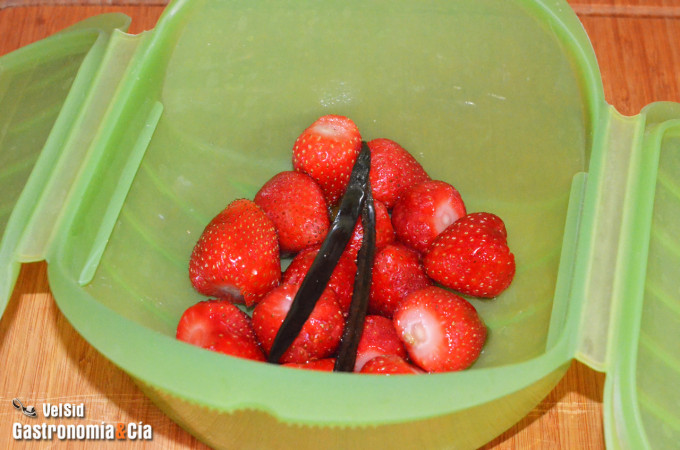 Cierra el estuche Lékué y cocina en el microondas durante 5 minutos a 800W. Si las fresas están muy maduras (esta receta es perfecta para aprovechar la fruta cuando está en ese punto, aunque se puede hacer también con la fruta en su mejor momento), puede que la compota esté lista en menos tiempo.