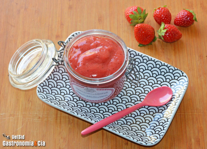 Retira la vaina de vainilla y pasa las fresas al vaso de la batidora si quieres triturarlas bien. Añade una pizca de goma xantana (muy poca cantidad, la punta de una cucharadita) y tritura hasta obtener una textura homogénea. Si deseas una consistencia más espesa, puedes agregar un poco más de xantana y batir nuevamente.