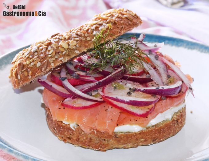 Bagel con ricotta, salmón ahumado y un toque de wasabi